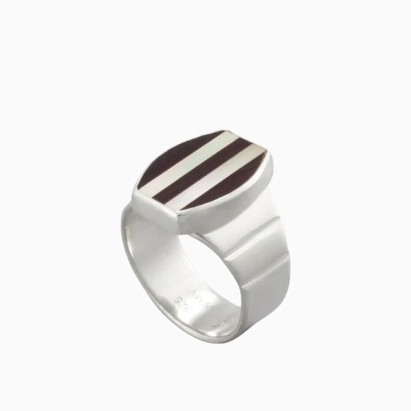 WIlliam Vanaria is a jeweler and metalsmith who creates unusual jewelry from non-traditional materials. Pictured is his Line Ring -Wood Lines featuring a flat inlay which consists of wood and mother of pearl to create a beautifully unique, one-of-a-kind design.