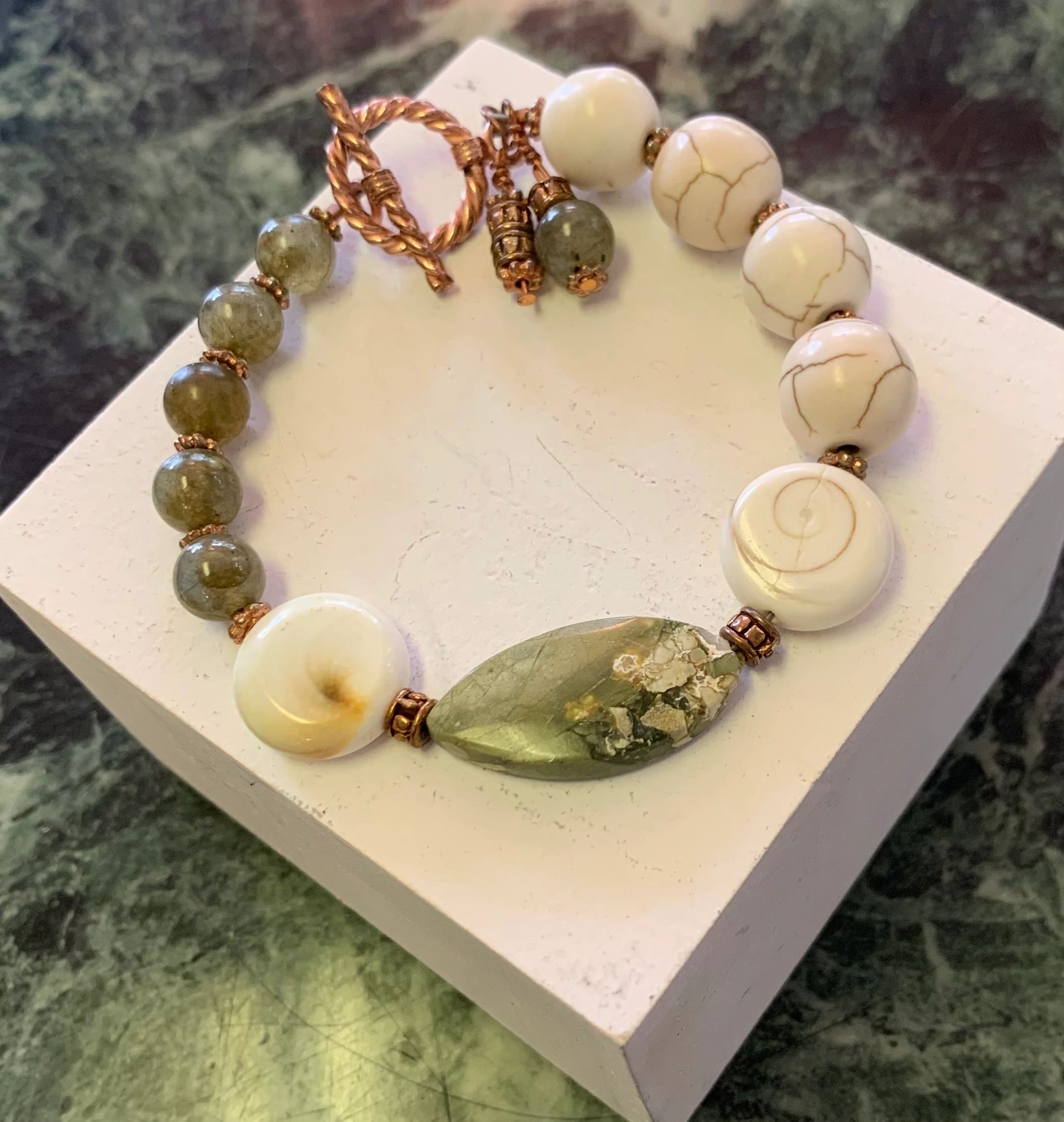 Rebecca Harriet has been making jewelry for over 22 years. Each stone is meticulously selected for its unique properties and transformative power; to not only make us feel more attractive, but to nourish our soul. Every piece is one-of-a-kind. Pictured is Rebecca’s asymmetrical bracelet featuring Jasper and Jade.